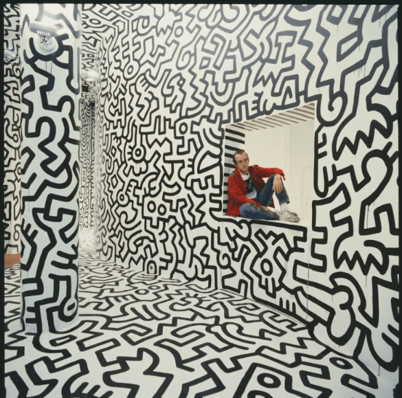 « Keith Haring , ancien protagoniste de la New Wave(1) et organisateur d’expositions au Mudd Club [une boîte de nuit de TriBeCa , active de 1978 à 1983]* et au Club 57 [une boîte de nuit de l’East Village, active de 1978 à 1983 (2), également fréquentée par Madonna et Cyndi Lauper ] , ancien vidéaste et l’un des jeunes artistes new-yorkais les plus appréciés, dissémine des graffitis à la surface et dans les cavités souterraines du métro new-yorkais. Son enfant radieux, ou radioactif, The Radiant Child , une petite poupée qui émet des rayons comme un halo, et qui est son symbole et son emblème, constitue un accompagnement constant pour ceux qui s’aventurent dans des incursions perceptives dans la ville, comparable à celle du rap ou du disco diffusés à la radio. Habile à dessiner rapidement sur toute surface plane – toile, papier, vinyle, murs extérieurs, clôtures en bois et panneaux publicitaires – Keith alterne sa pratique en atelier avec ses œuvres en extérieur. Keith dessine en extérieur pour offrir son art à tous ceux qui ont des yeux, et pas seulement un portefeuille. De plus, son art est parfaitement transposable à la maison pour quiconque le reconnaît : ses dessins sont souvent réalisés spécifiquement sur des fragments amovibles de pierre ou de bois. L’écriture de Keith est picturale, composée d’enchevêtrements d’encre ou de traces de craie blanche qui coulent tels des flots d’images en constante interpénétration et métamorphose.