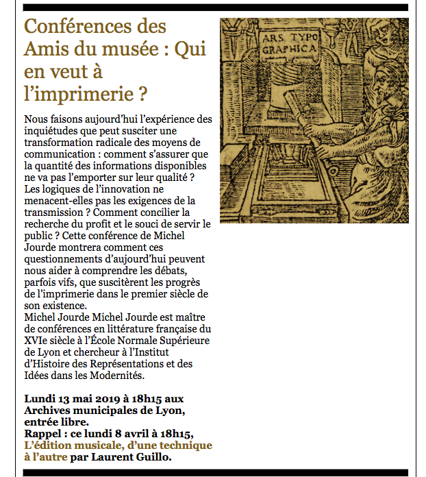 Des expositions dédiées seraient également produites telles les expositions du musée de l’Imprimerie de Lyon : Le musée de Loire (Maury) Et de Strasbourg