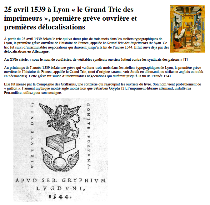 On rappellera en terme d’action des ouvriers de l’imprimerie dans les grandes grève, notamment un des premières grève d’ouvriers en France ou le TRIC de Lyon en 1539.