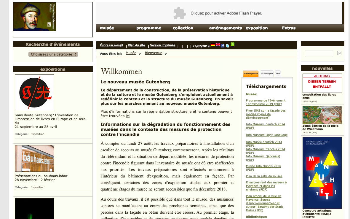 Mayence, Musée Gutenberg Le Musée Gutenberg s’auto désigne Musée mondial de l’Imprimerie, il compte parmi les musées de Mayence, Sa missions principale est d’enrichir, de conserver, de documenter et de valoriser auprès de divers publics le patrimoine livresque et graphique de l’histoire de l’imprimerie.