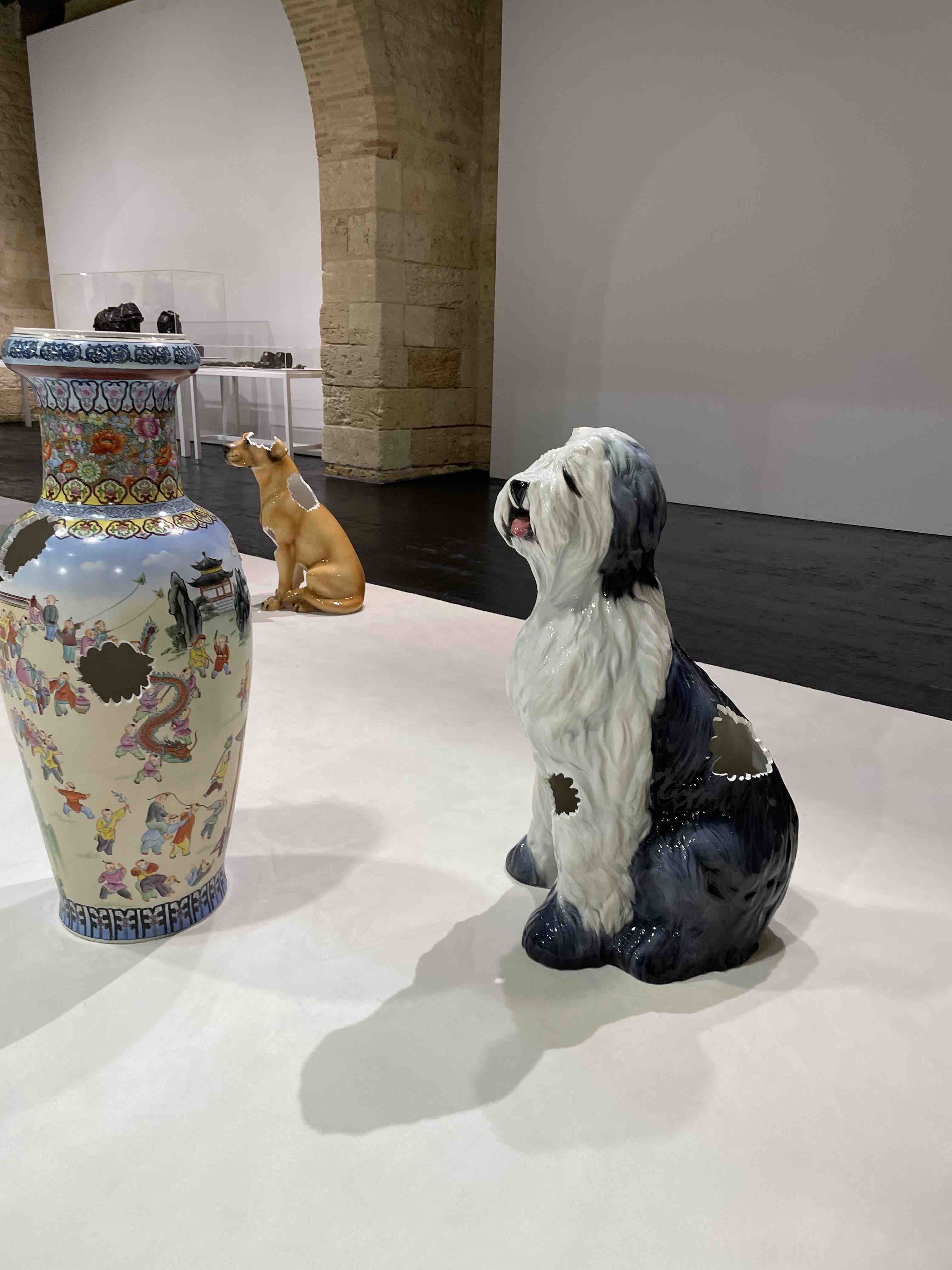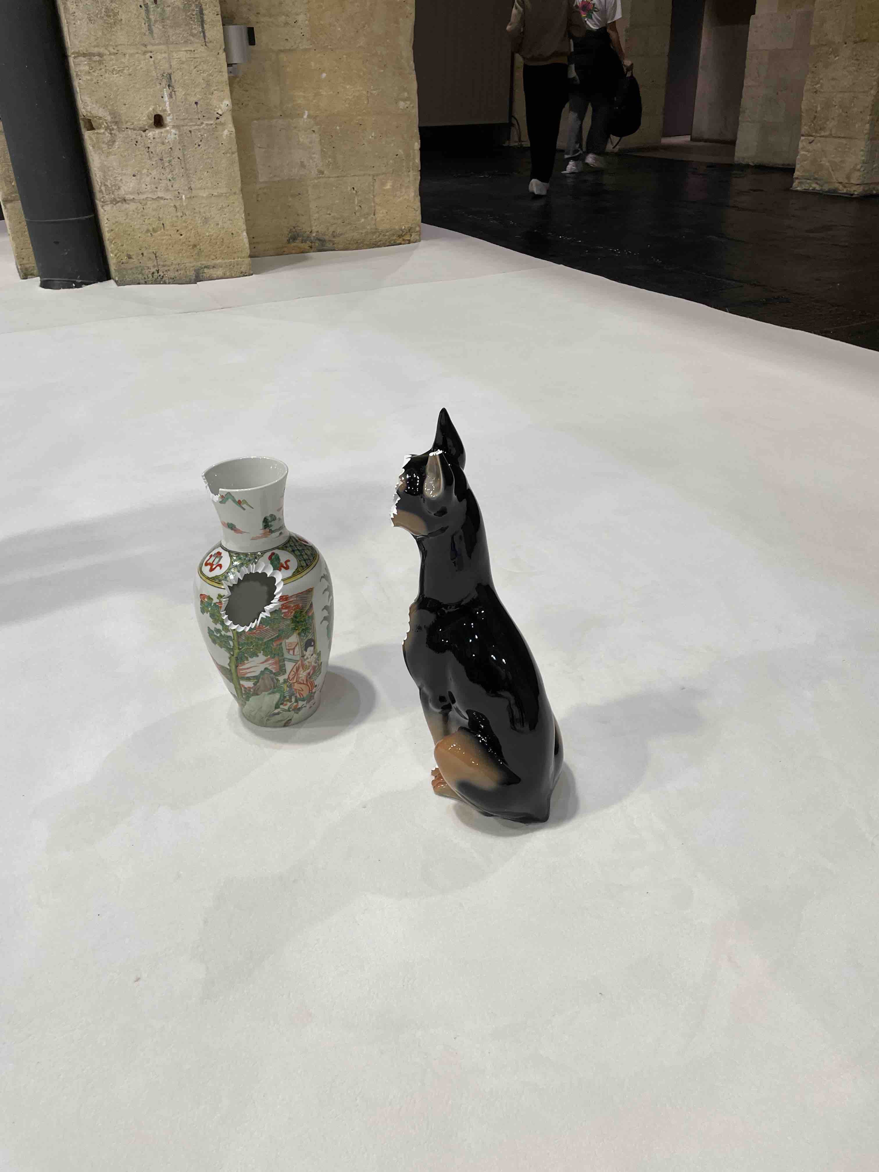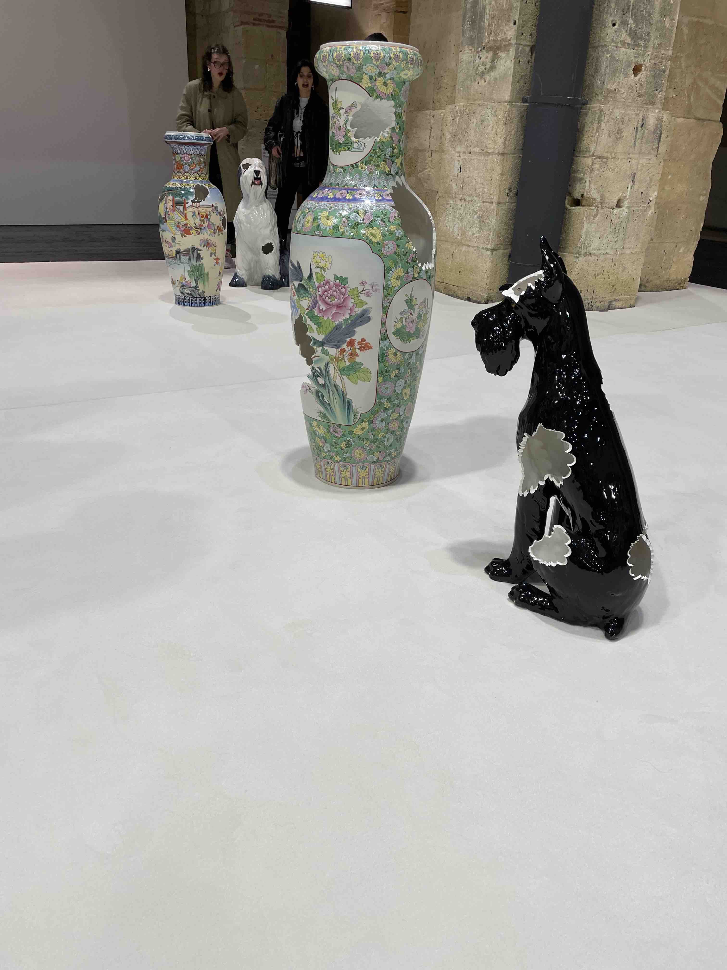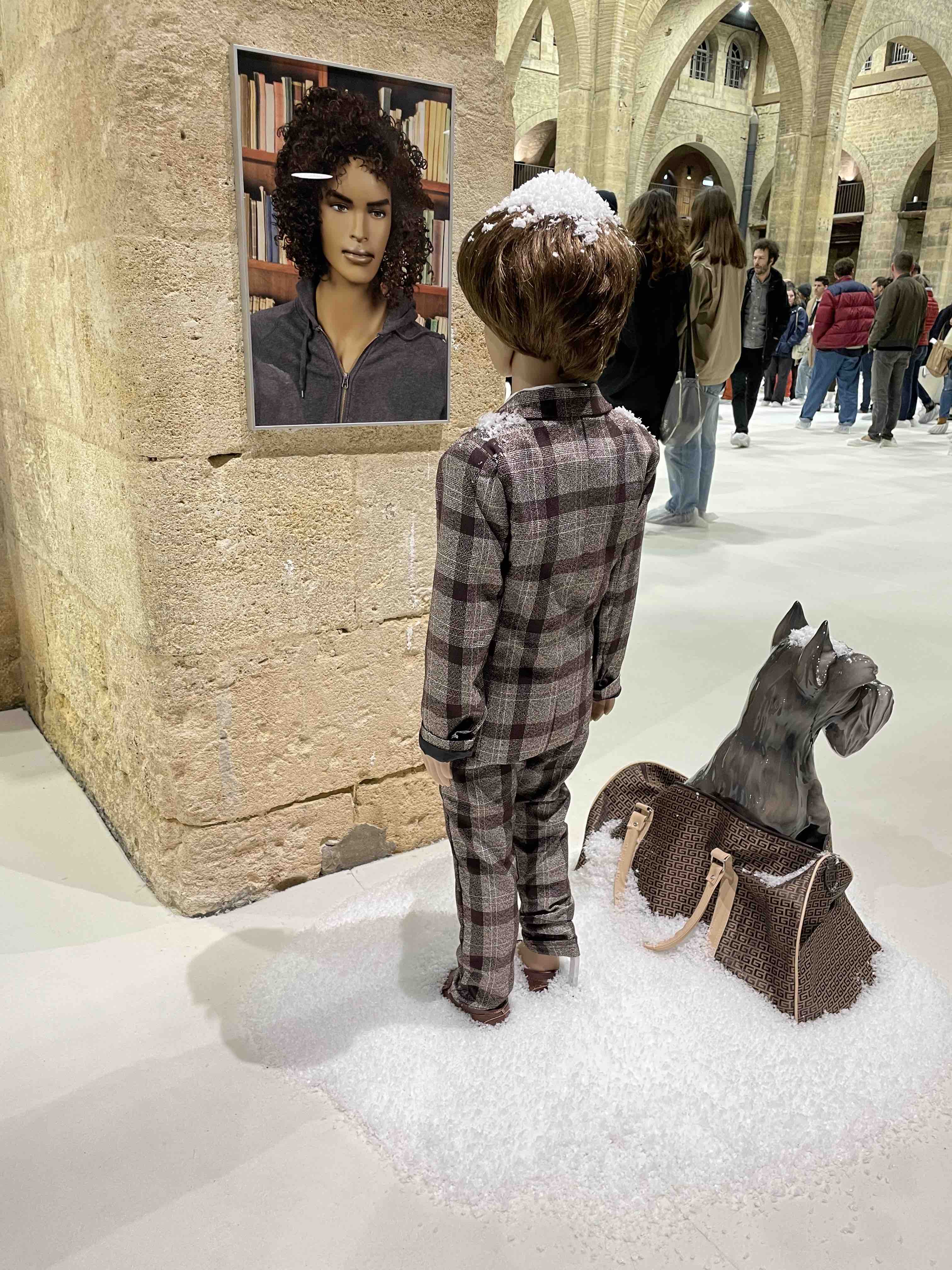 d’ un week-end low-cost de voyageur Airbnb, venu s’envoyer en l’Air avec une vol pour rien. Là, s’étendent sous verre de sécurité, la blague des touristes, ces serviettes de plages imprimées des monnaies fortes – ou des tapis de micro prière plaqués de perruques en cheveux aux teintes vaguement naturelles, plus loin se jouent des colloques entre Chien faïence et vase de Chine de bazaar qui s’envisagent de leurs surfaces dévorées par une espèces d’extra-terrestre croqueurs de mites porcelaine – Il y a aussi d’émouvantes gisantes, fantômes enfuies, aux robes de mariées en voile de synthétiques à points brodé transparentes, aux jupes bourrés de bourres de cheveux, de crins, de grains ou chanvres – Travail de la tête, c’est aussi beaucoup de cheveux qui débordent en mèches comiques, moumoutes pilotes de mini voitures télécommandées de luxe rasant le sol – on est à la foire aux sens et aux interprétations. Devant les piliers de pierre du CAPC des enfants mannequin de cire s’ennuient, avec à leurs pieds gisant comme sacs gibecières des écoliers d’antan des sacs de luxe (ou leurs répliques) débordant de gueules de chiens en faïence, ils posent comme pénitents recueillis (des rappels des ambiances du photographe Bernard Faucon) leurs sages sandales enneigées d’artificielle devant des écrans plats de portrait d’une famille virtuelle.