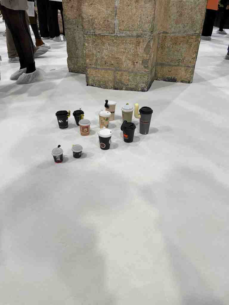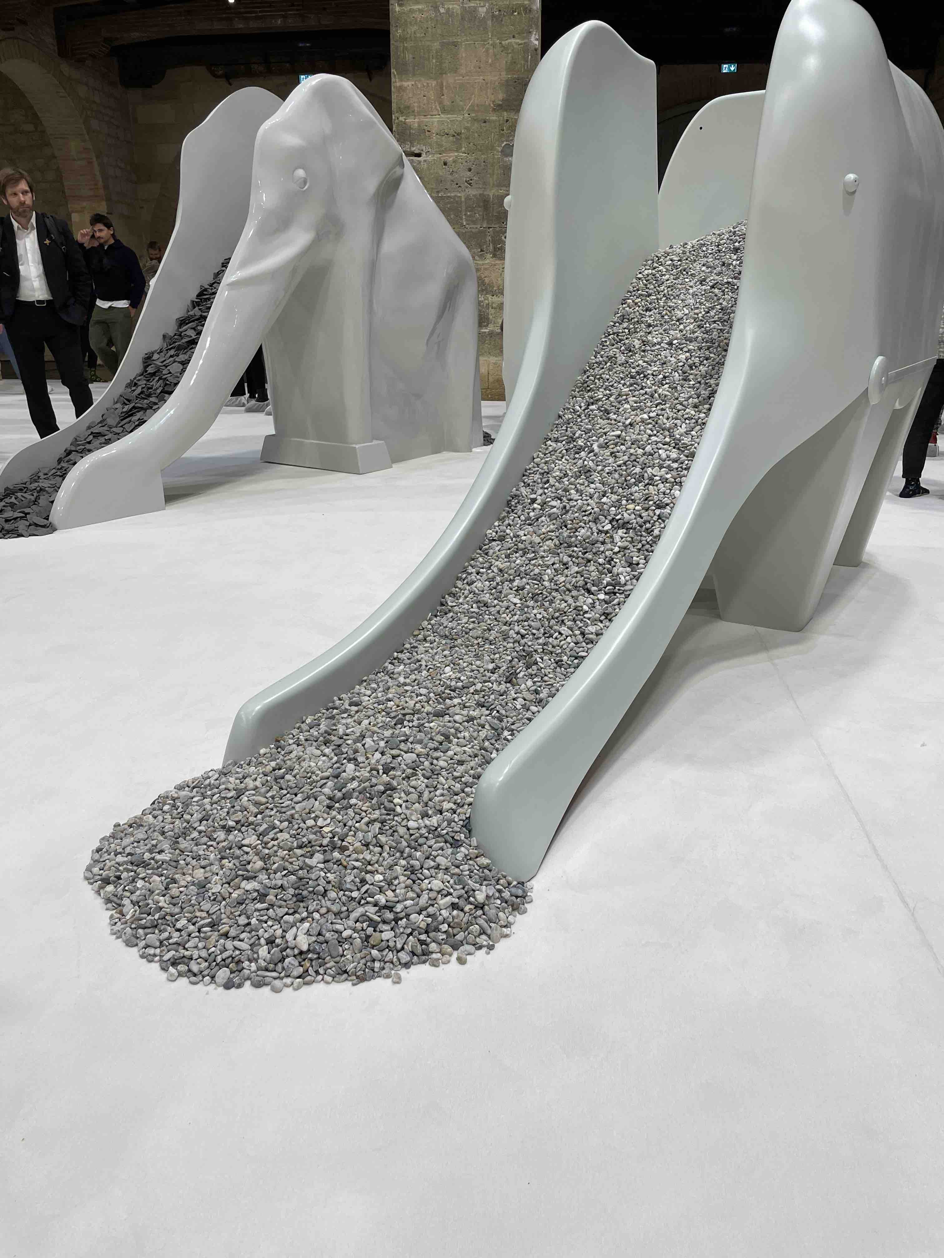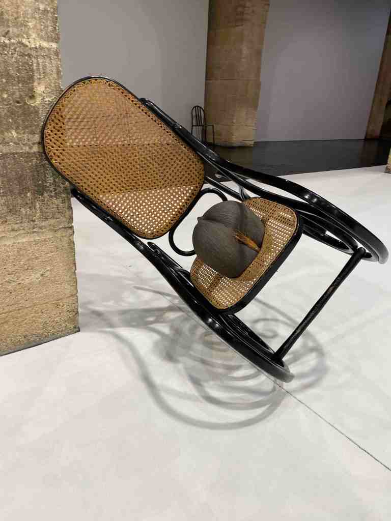 Des cages aux oiseaux-maison jouent les vitrines d’une vaisselle de chine, entre mise en scène pour enseigne de luxe ou parabole de la capture du kaolin chinois par l’occident germain du secret de la faïence ? l’essentiels reste que l’on s’en balade, balançant entre les sens et les interprétations, amusés parfois narquois, entre ces baignoires remplies d’œufs de marbre aux usages variés, et les mini poussettes de poupées remplies de mignonnettes d’alcool de mini fridge d’’hôtel « not at all included », des fauteuils à bascule en bois tournés, de belles des îles, portent leurs assises d’osier percées de coco fesses, les interprétations fusent et les sens se gaussent. Dominés par un canapé de cuir bousculé épigone de la scène dans la nef, comme le monolithe des premiers hominidés grimés de 2001 l’Odyssée de l’espace, nous sautillerons devant les feux de charbon de baguettes brulées.