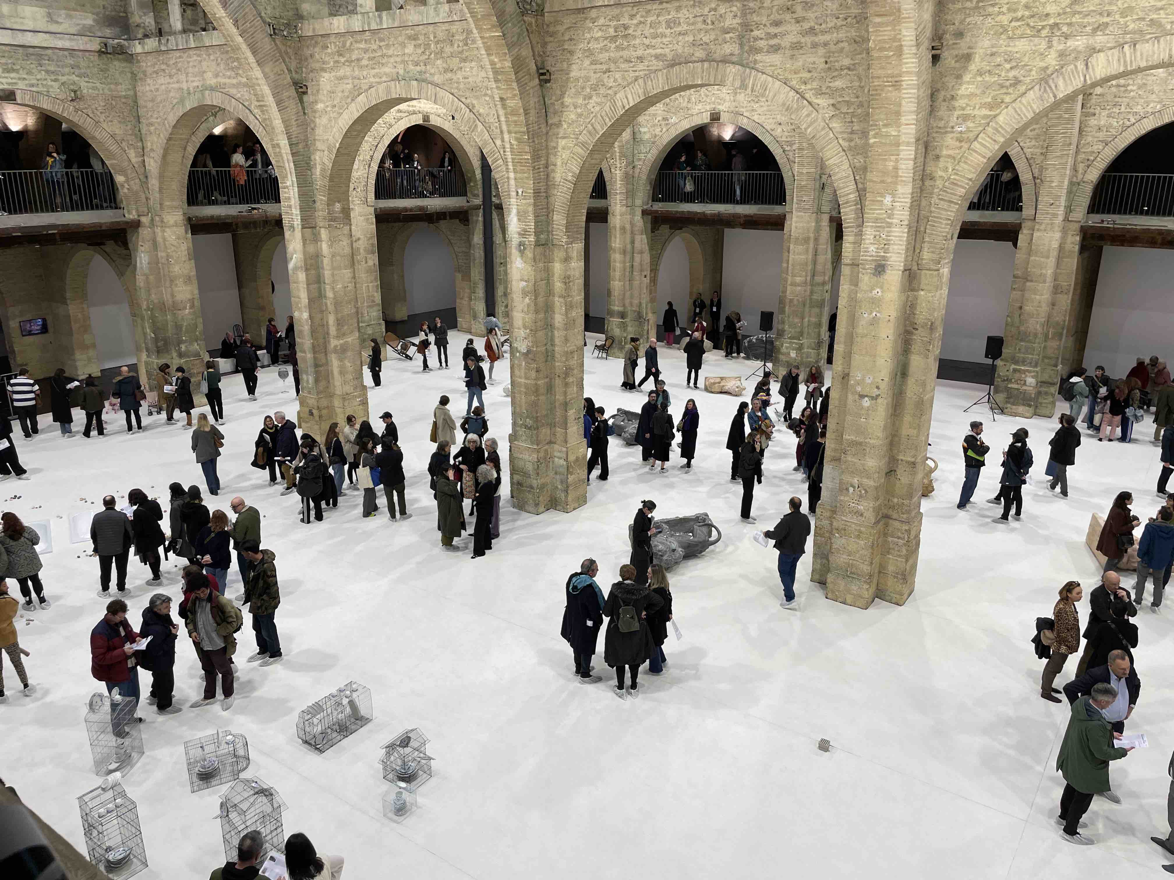 Plus en forme que les Galeries Lafayette, où tout cela vrille et pétille, le soir de vernissage, la file formée au dehors se presse, puis se déchausse, se ‘’chaussette’’ pour défiler en procession autour des pièces d’expositions étalées et disposées comme autant de puzzle de sens sur cette super moquette crème, éblouissant les arches de l’entrepôt, redevenu un grand magasin.