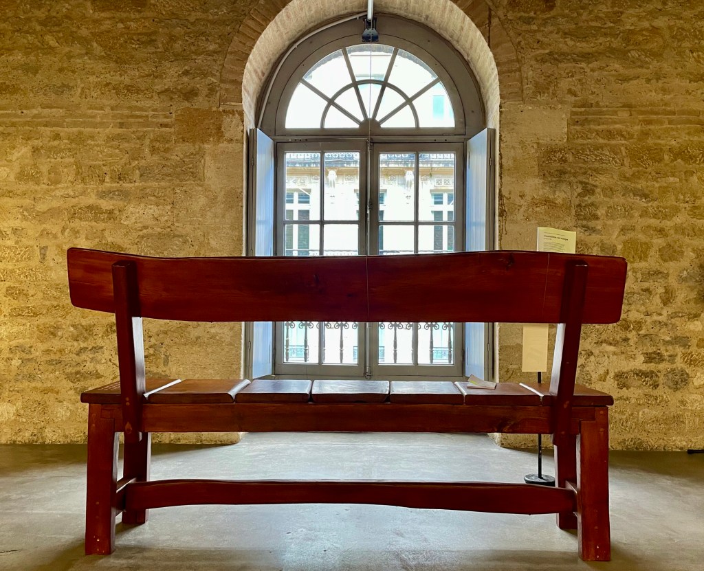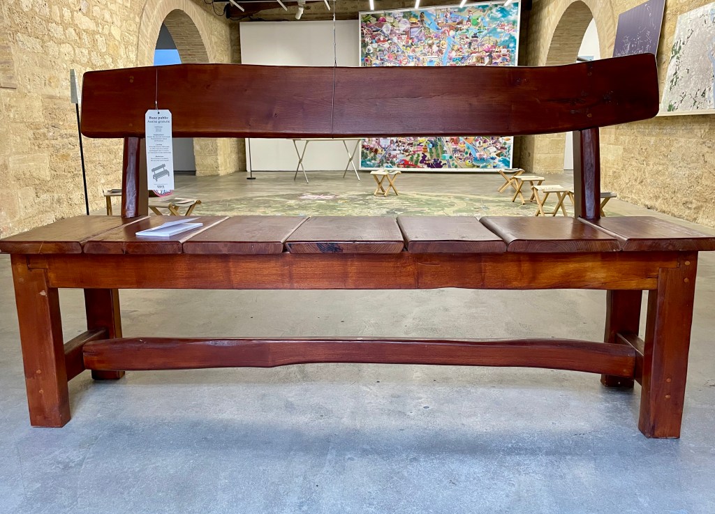 À noter, l’intéressant échantillonnage de bancs publics qui ponctue les stations de la visite, des pauses imposées par la diversité de lectures, nombreuses, des cartels sur petites bannières. Bancs publics, où, quand ces lieux hautement symboliques soulignent leur statut contesté d’une ville partagée. C’est ici, où l’on peut s’asseoir un petit moment de calme et de repos, quand on est âgé et en marche, mais ces havres municipaux, pour reprendre son souffle sont questionnés et revendiqués également par une population qui dérange et stationne parfois là, à défaut d’avoir trouvé un sens autre à sa vie qu’une prochaine dose de stupeur et un refuge pour dormir entre ses chiens, d’où la disparition des bancs pour des blocs de gisants allongés en bétons froids, entre autres variations de blocs anti paniques en pause rapide.