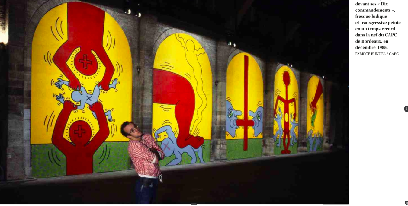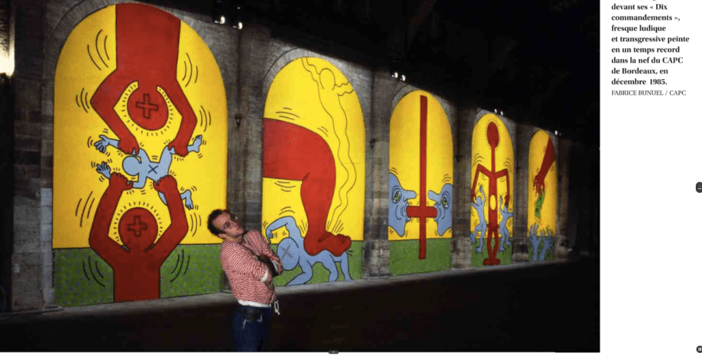 Sa vision en couleurs primaires des 10 commandements est achevée en 5 jours ou 3, selon la légende, ou plutôt 10 selon les témoins du temps, soit entre une semaine et trois jours entiers au son de son ghetto blaster à plein volume, selon Dominique Beaufrère qui assurait les missions de communications et d’enregistrements des événements, de l’Art-bus entre autres dans les animations et médiations culturelles, sous l’égide de Jossy Froment. Dix commandements, dont l’artiste confesse lui-même (interview) qu’il avait peu de références, mais dont il s’empare par son sujet moral qui l’inspire pour dresser un commentaire illustré du climat social de l’époque*. C’est aussi, quoi qu’il soit estimé dans son expression à l’époque, ce qui reste de la nature d’une performance, puisque cette disponibilité était aussi sa signature du type performatif, l’artiste devenait un accessoire auquel on accédait en extension à son exposition, dans une totale manipulation et une disponibilité aux requêtes de l’assemblée. Une présence-témoignage que d’autres artistes pratiquent, en présence d’un public, signant serviettes, nappes et programmes, mais ici, avec Keith Haring c’est la nature même de la forme de l’artiste, dans ces traits qui sont diffusés à foison et produits de la main de son créateur. La particularité pour l’époque et ce qui a pu désarçonner les opinions d’un public peu enclin aux nouveautés et au bousculement des valeurs, c’est toute la surface d’exposition du CAPC qui lui était consacré. C’est également ce qui est savoureux quand on pense au fait qu’il a exécuté sa version des 10 péchés capitaux, la nef accédant ainsi au statut de temple d’un culte de citation profane des écrits sacrés. Les autres galeries étaient ouvertes et emplies pour l’exposition de ces toiles en tous types de formats et d’autres interventions sur les murs des cimaises, avec des irruptions graffées de personnages et toutes les interactions symboliques de ces créatures surgissant au trait du Magik Marker.